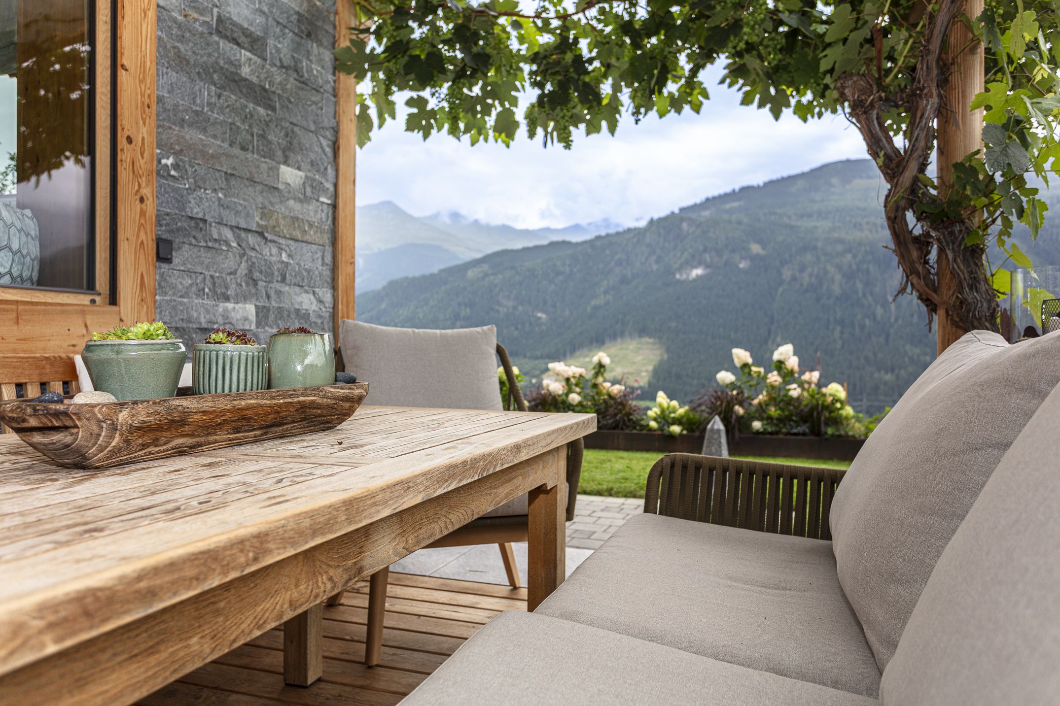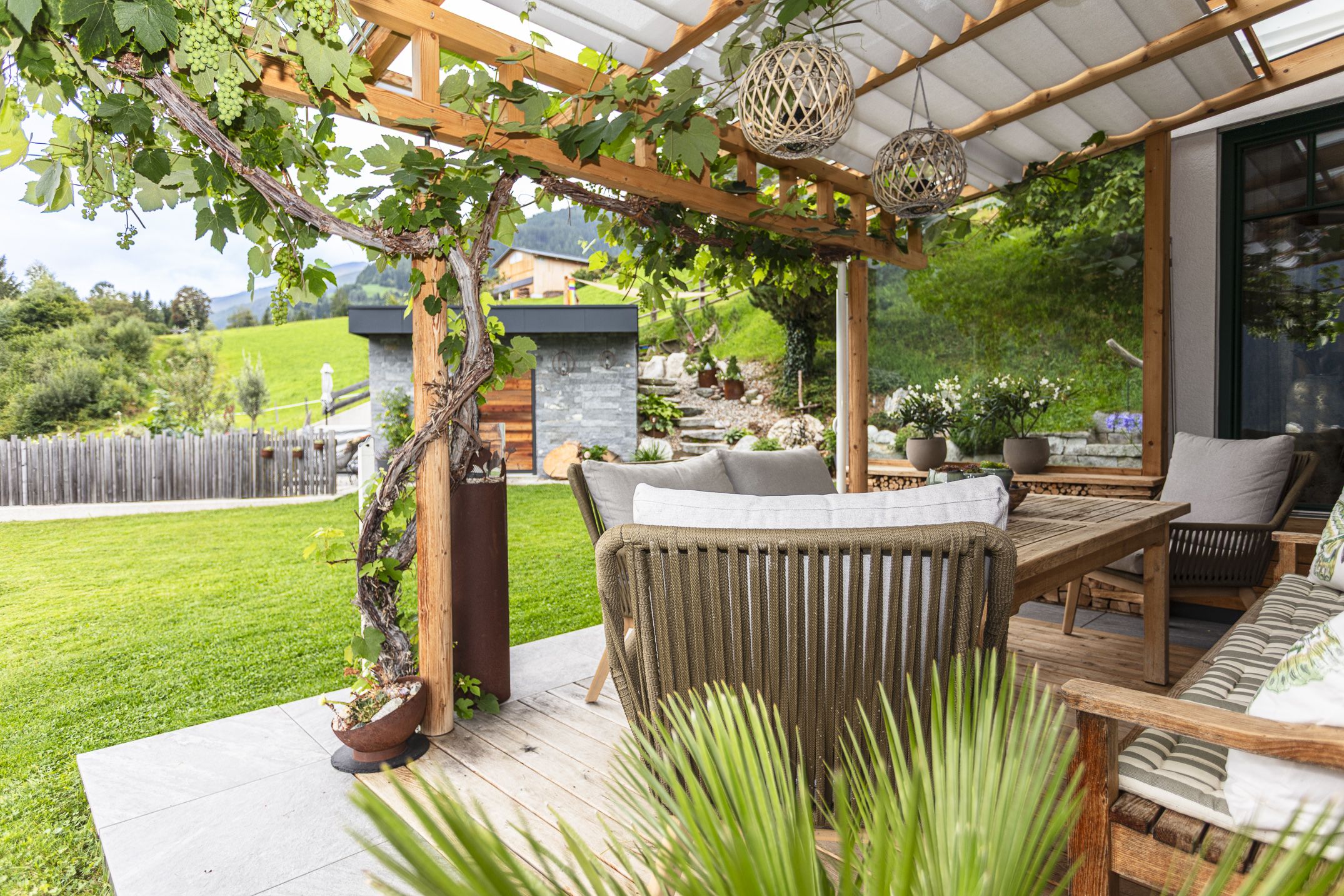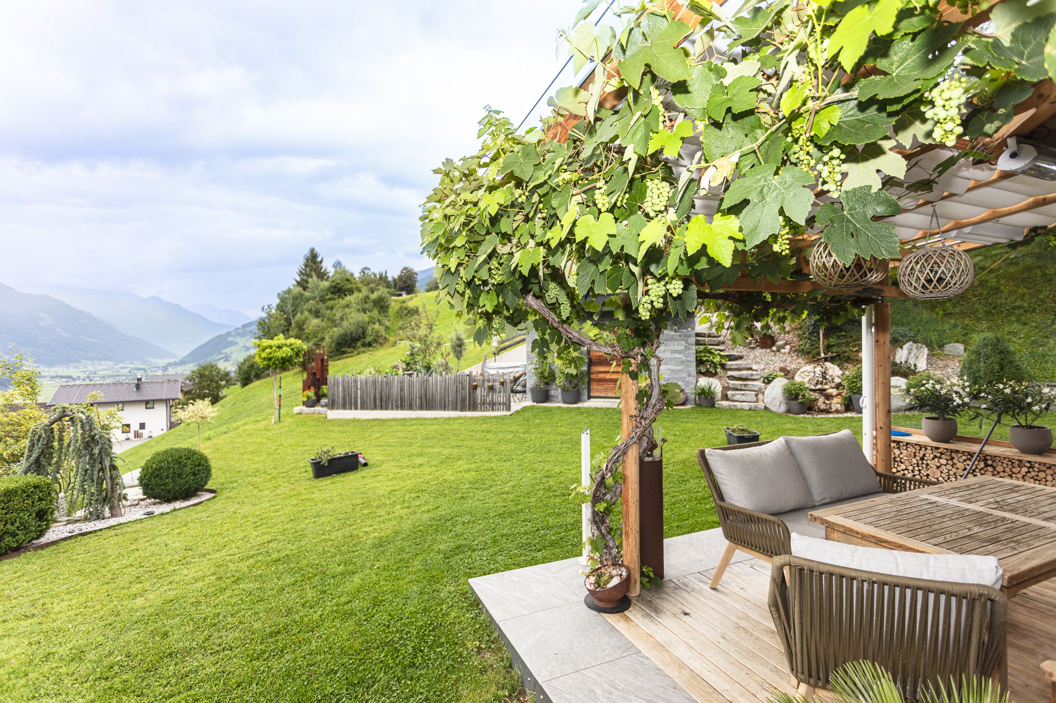 Rund um das Haus finden Sie viele kleine Lieblingsplätze: eine sonnige Terrasse mit Panoramablick, eine geschützte Grillecke für gemütliche Sommerabende und einen liebevoll gepflegten Garten mit Platz zum Spielen, Entspannen und Staunen. Besonders in den Abendstunden, wenn das Licht über die Berge wandert, entsteht hier eine Atmosphäre, die man nicht so schnell vergisst.