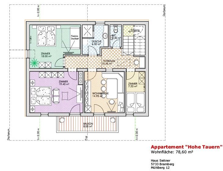 Die Ferienwohnung „Hohe Tauern“ im 2. Obergeschoss bietet auf 78,60 m² Platz für bis zu 8 Personen – ideal für Familien oder Gruppen. Eine gemütliche, voll ausgestattete Wohnküche mit Geschirrspüler, ausreichend Geschirr, Gläsern und Kochtöpfen lädt zum entspannten Kochen ein. Drei komfortable Schlafzimmer sorgen für erholsame Nächte, während das Badezimmer mit Dusche, extra WC und Waschmaschine zusätzlichen Komfort bietet. Bettwäsche sowie Hand- und Badetücher sind selbstverständlich vorhanden.
